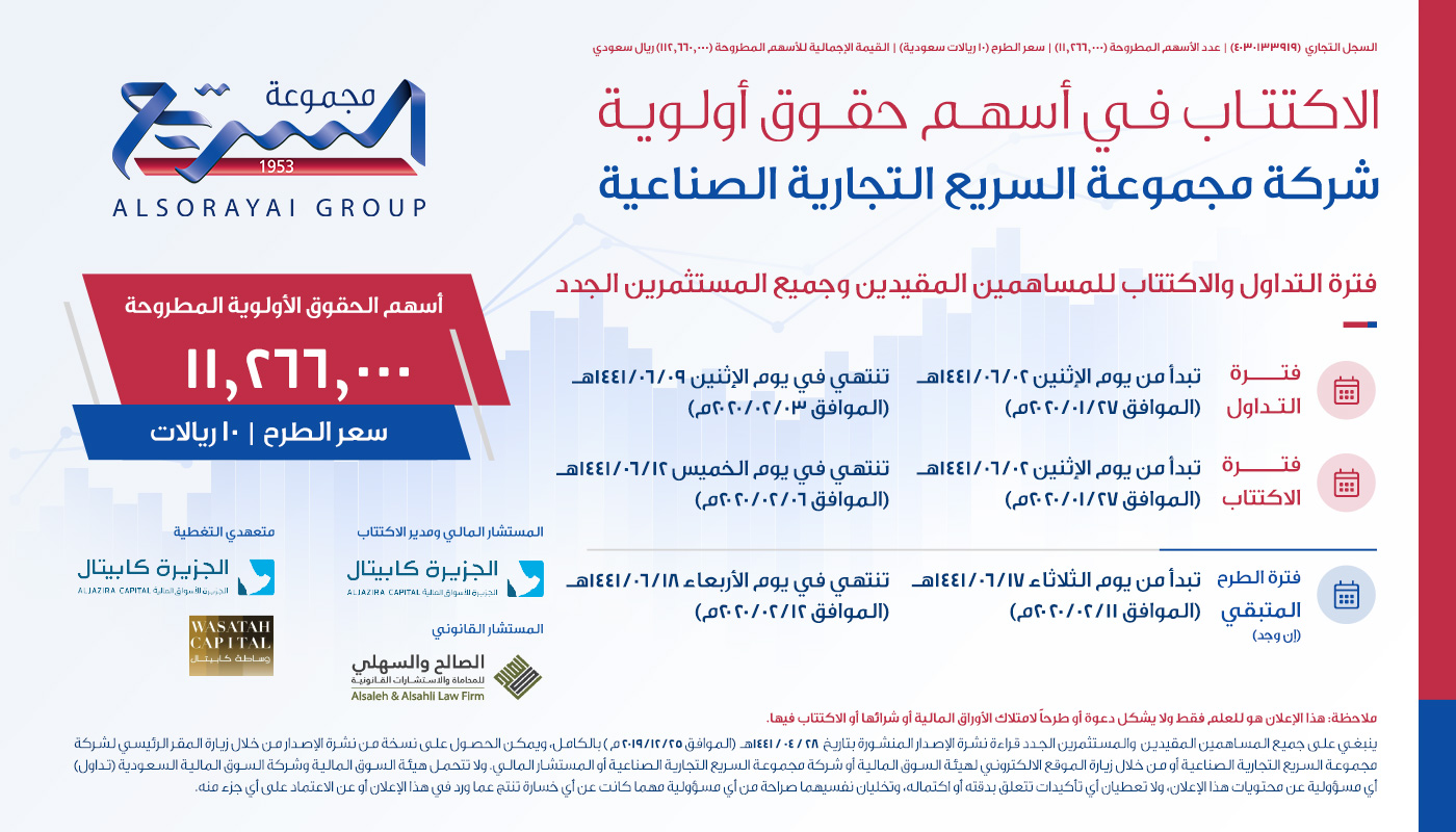 مجموعة السري ع التجارية الصناعية On Twitter الاكتتاب في أسهم حقوق أولوية شركة مجموعة السريع التجارية الصناعية عدد الأسهم المطروحة 11 266 000 سهم سعر الطرح 10 ريالات للسهم فترة التداول تبدأ الإثنين 2020 01 27م