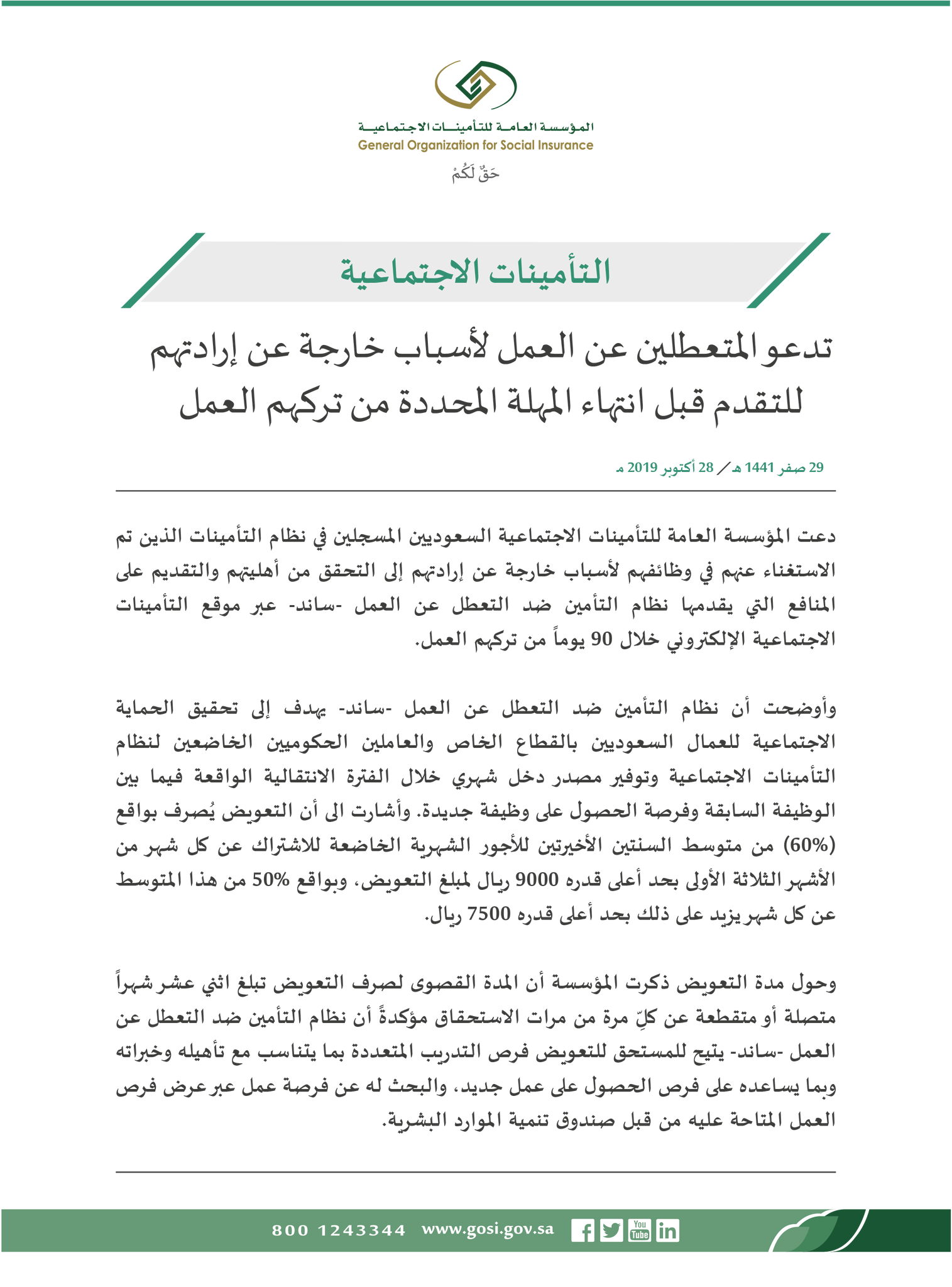 التأمينات الاجتماعية On Twitter التأمينات الاجتماعية تدعوا المتعطلين عن العمل لأسباب خارجة عن إرادتهم للتقدم على ساند قبل انتهاء المهلة المحددة من تركهم العمل Https T Co Vbtxgqrr8t