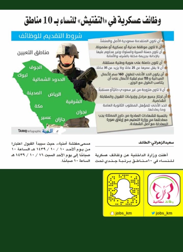حنـان وظائف نسائية On Twitter وظائف نسائيه عسكرية في التفتيش للنساء ب 10 مناطق بالسعودية أعلنت وزارة الداخلية عن وظائف للنساء في 10 مناطق برتبة جندي تحت مسمى مفتشة